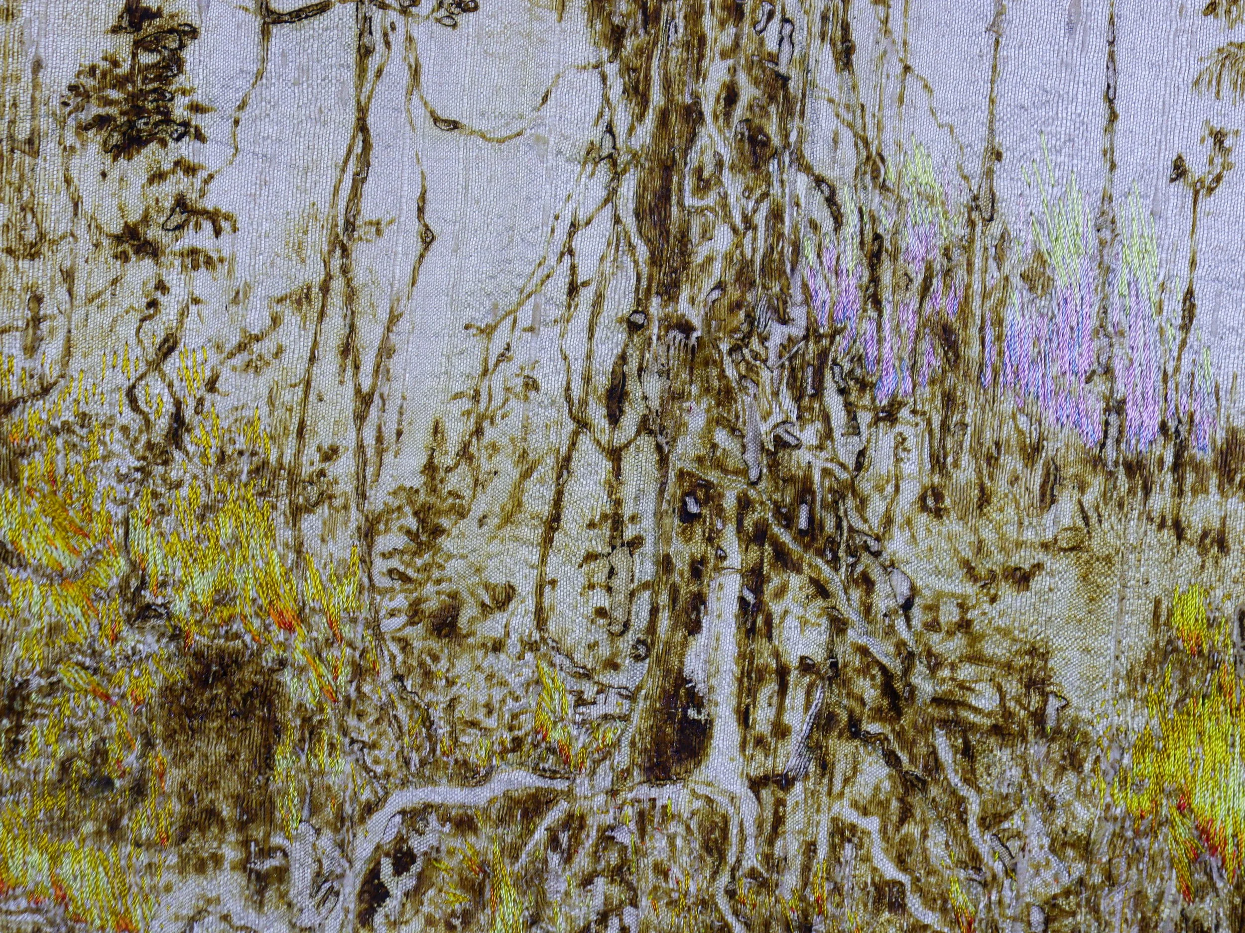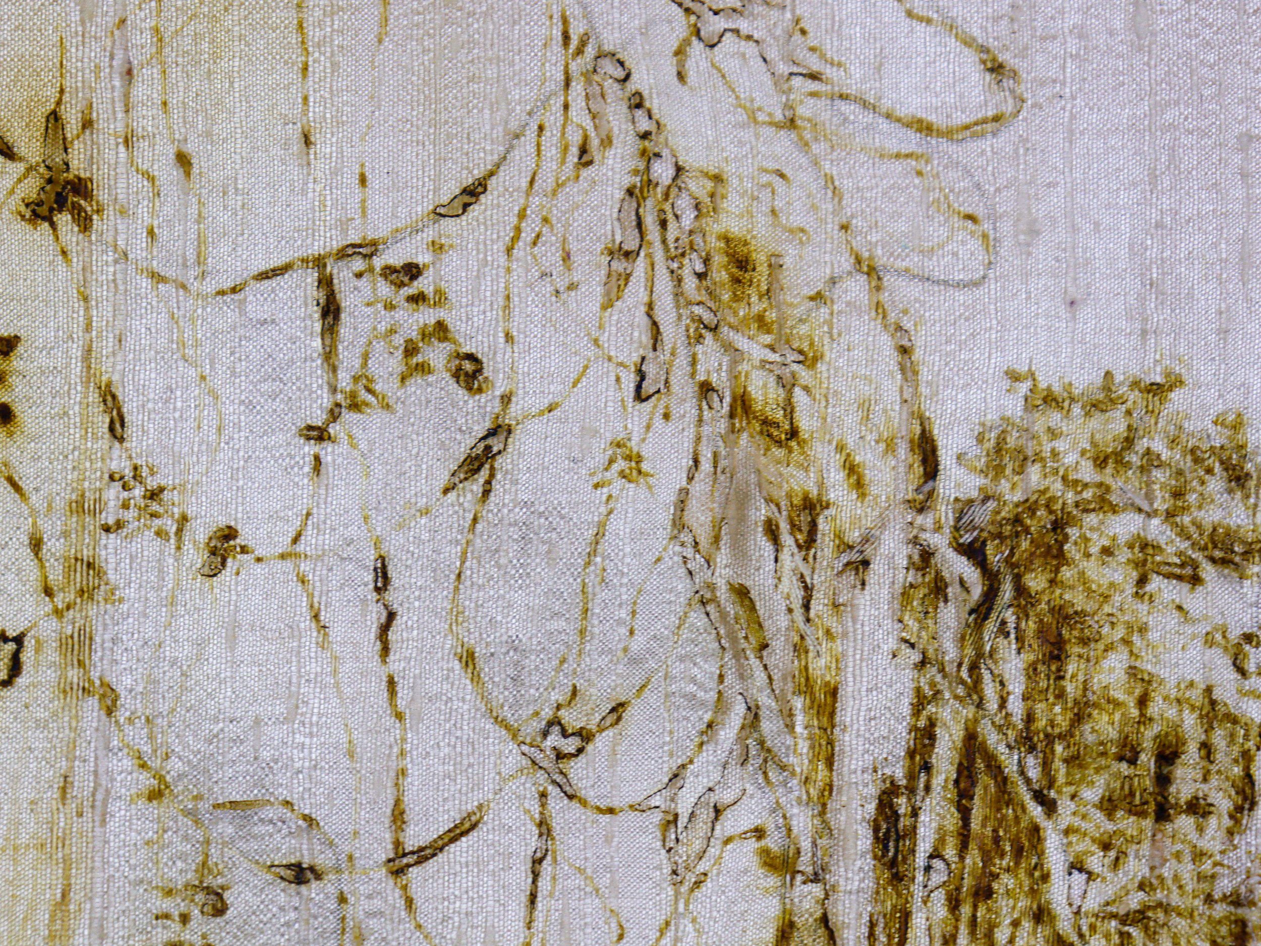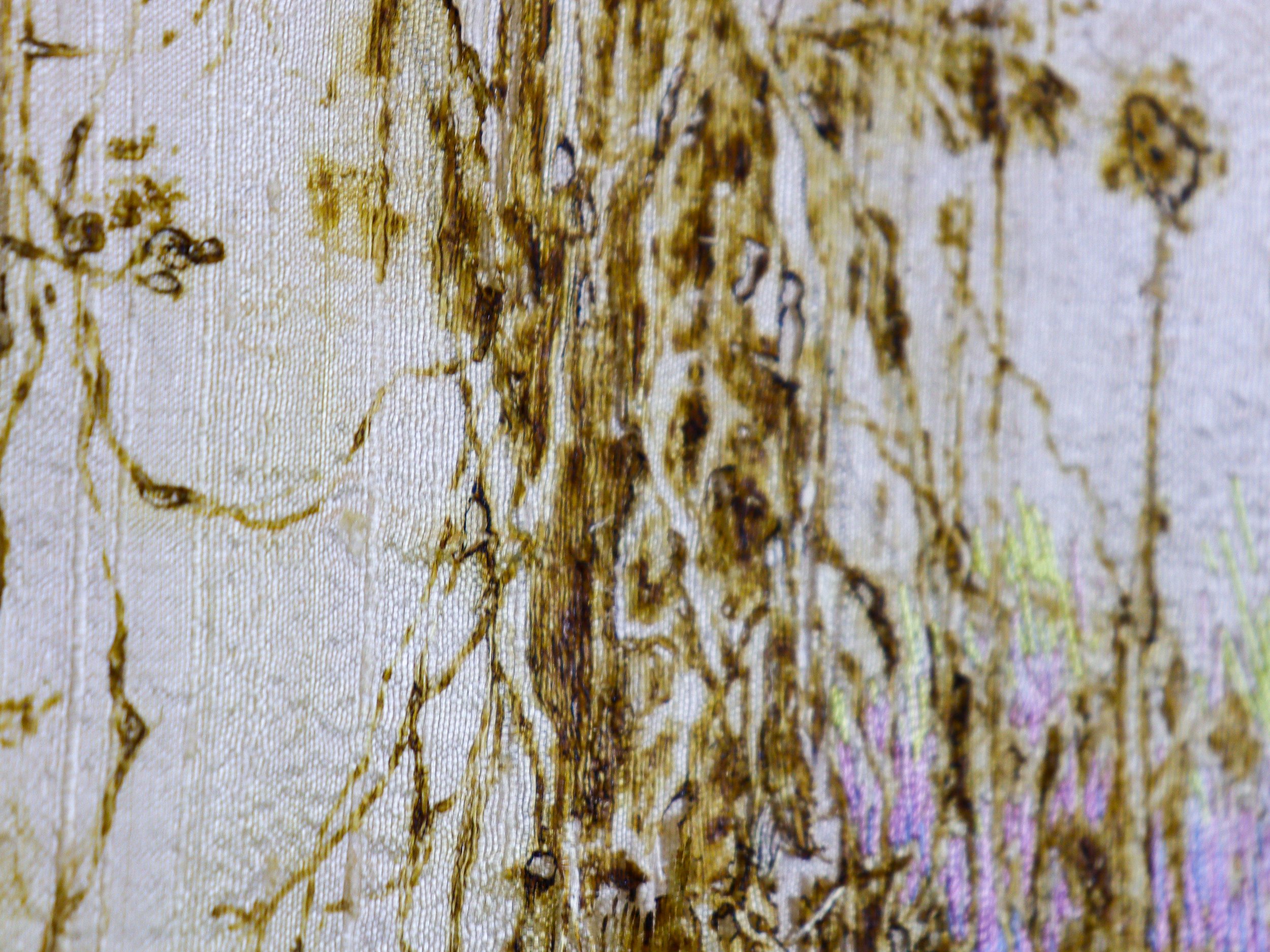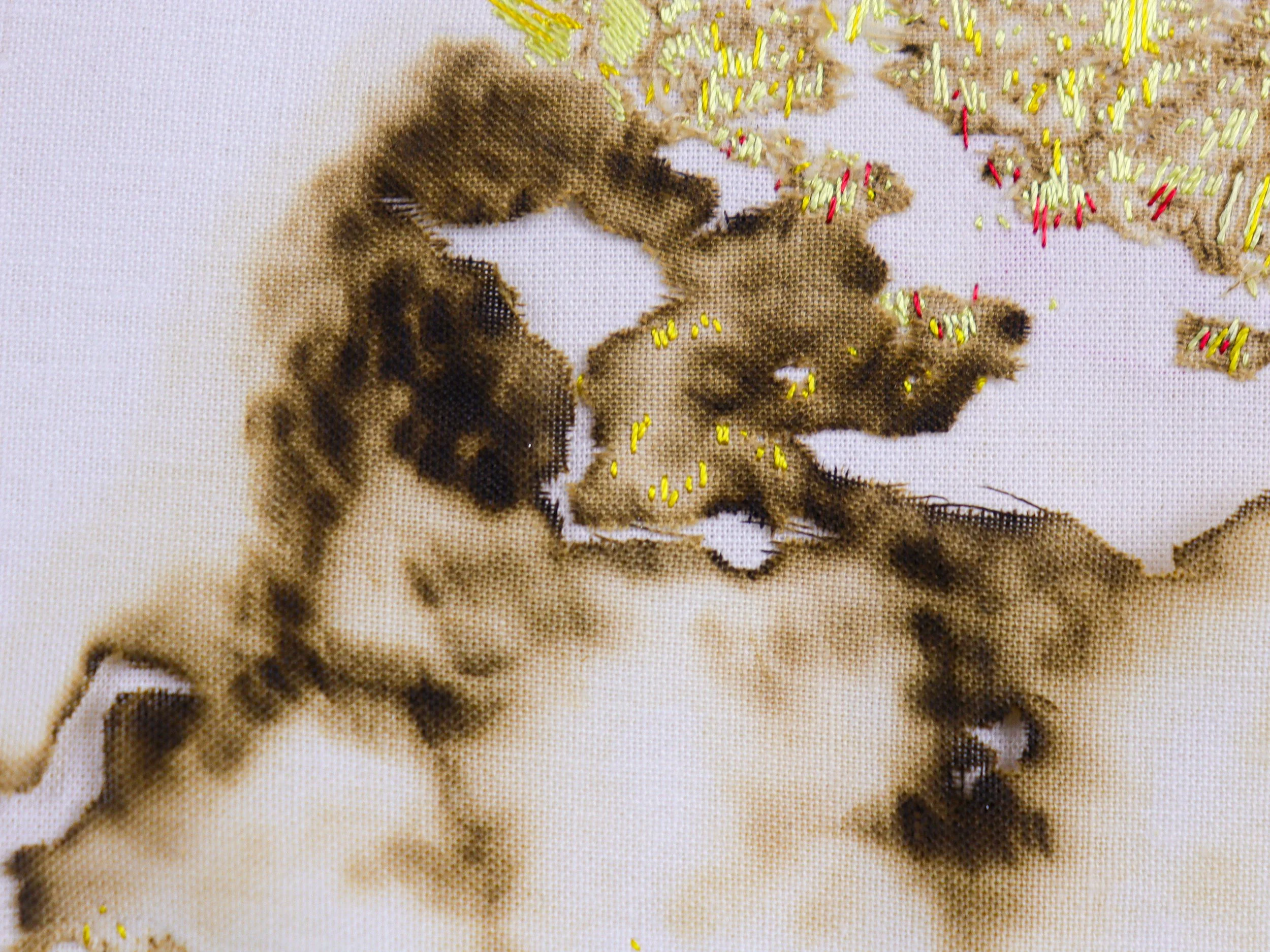 Après ce travail de destruction du support, je viens ensuite longuement, inutilement, raccommoder le dessin en le brodant au fil de soie. Ce travail délicat contraste avec le sujet, mais aussi avec la brutalité du processus. On retrouve l’idée d’une réparation, d’un soin porté à ce corps commun que l’on appelle le monde.