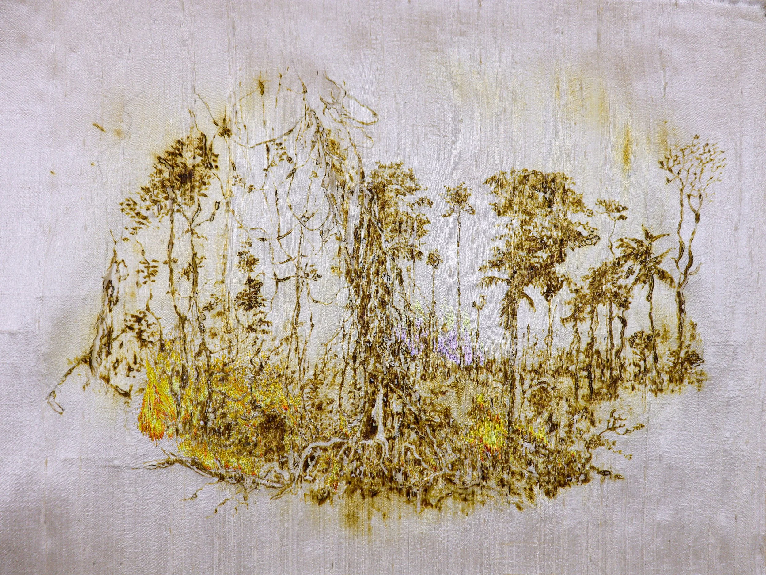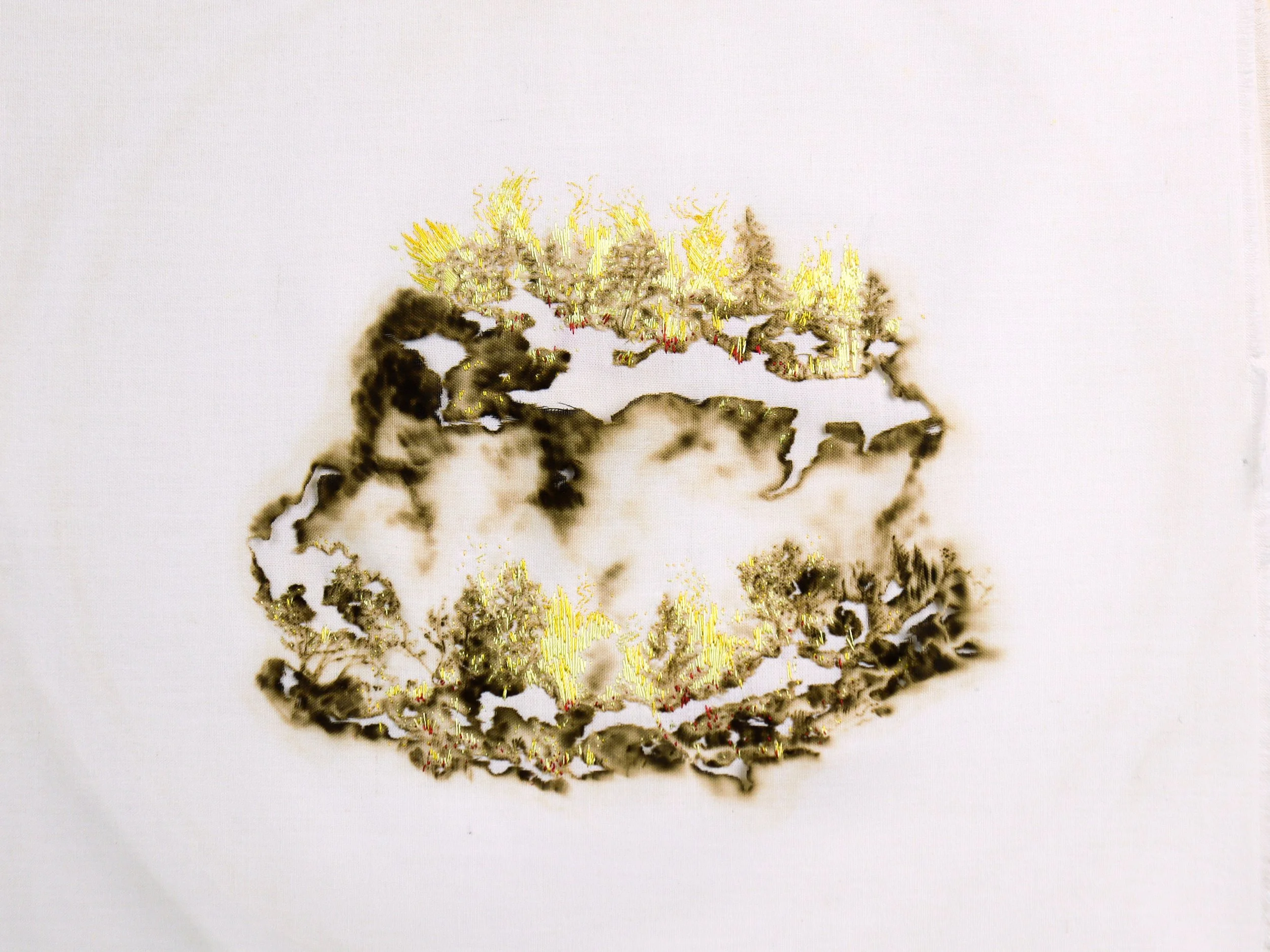Ces dessins évoquent les giga-incendies qui dévastent les forêts depuis le début de la crise climatique liée à l’activité humaine (ici au Brésil ou en Californie). Le dessin se veut précis, documentaire, mais le dessin échappe forcément au contrôle lorsque le textile prend feu et produit des crevées. j’éprouve avec mon corps les chaleurs anormales qui sont maintenant notre quotidien, et m’impose de mesurer par ùes propres limites celles de notre planète.