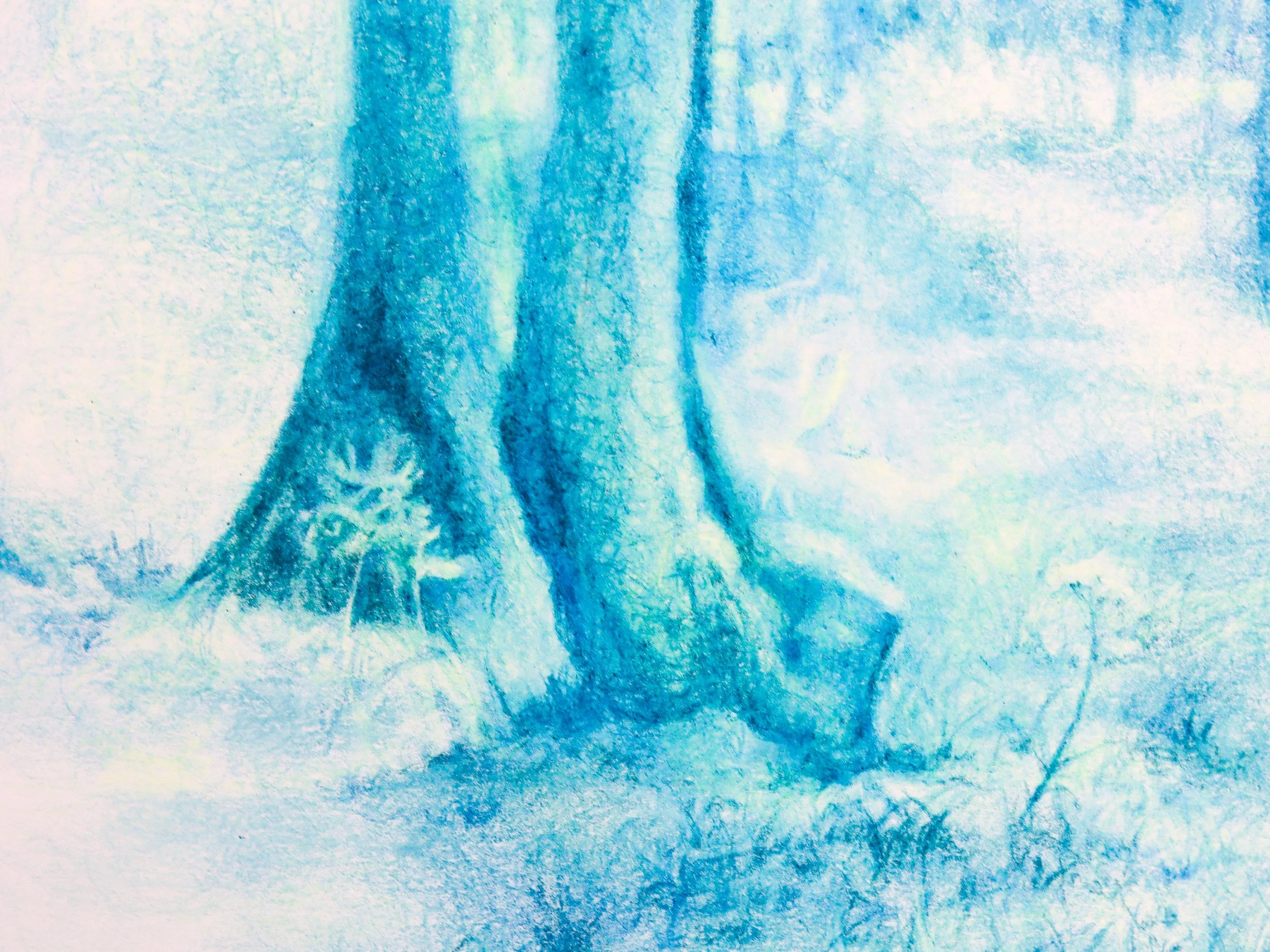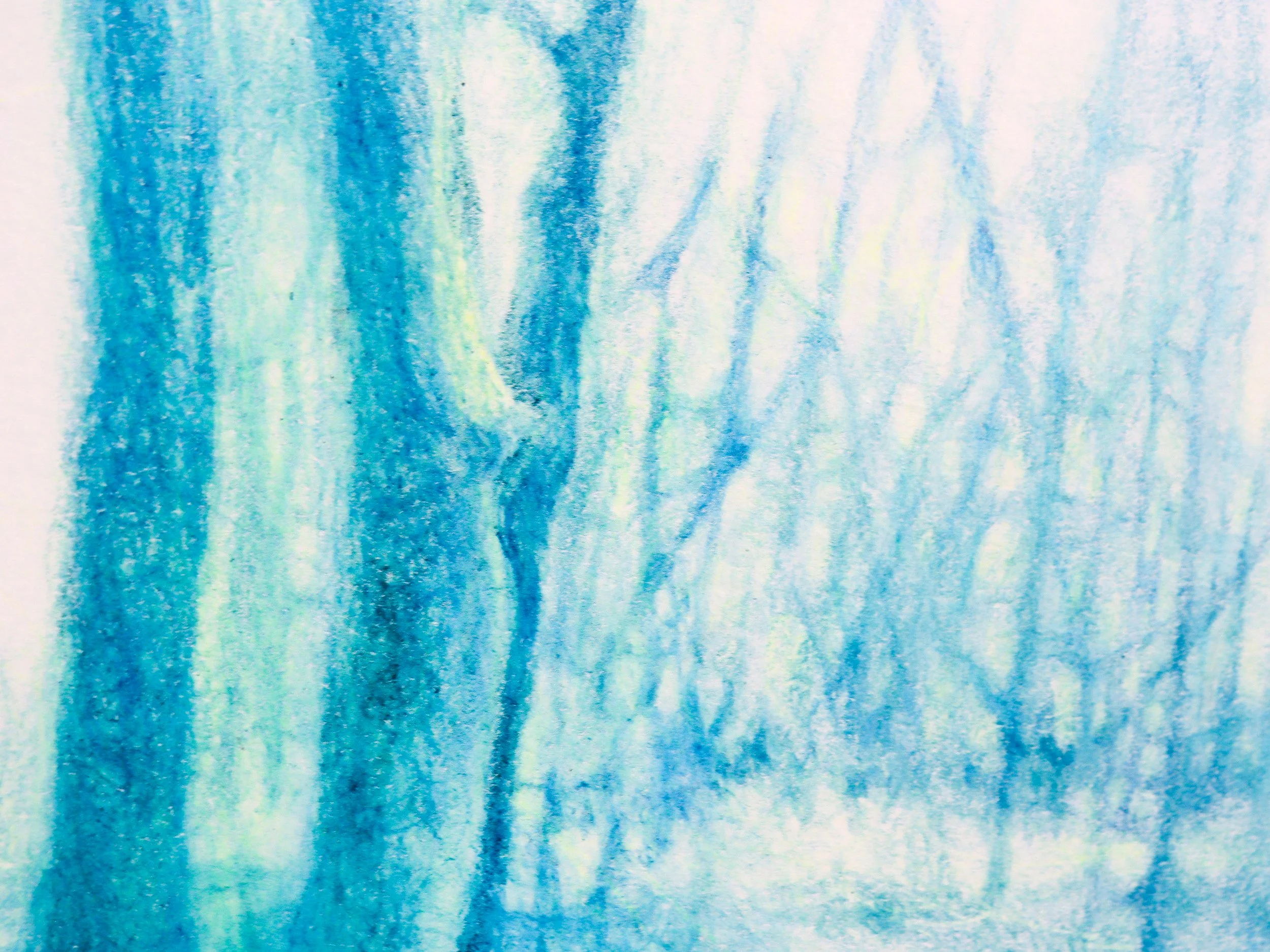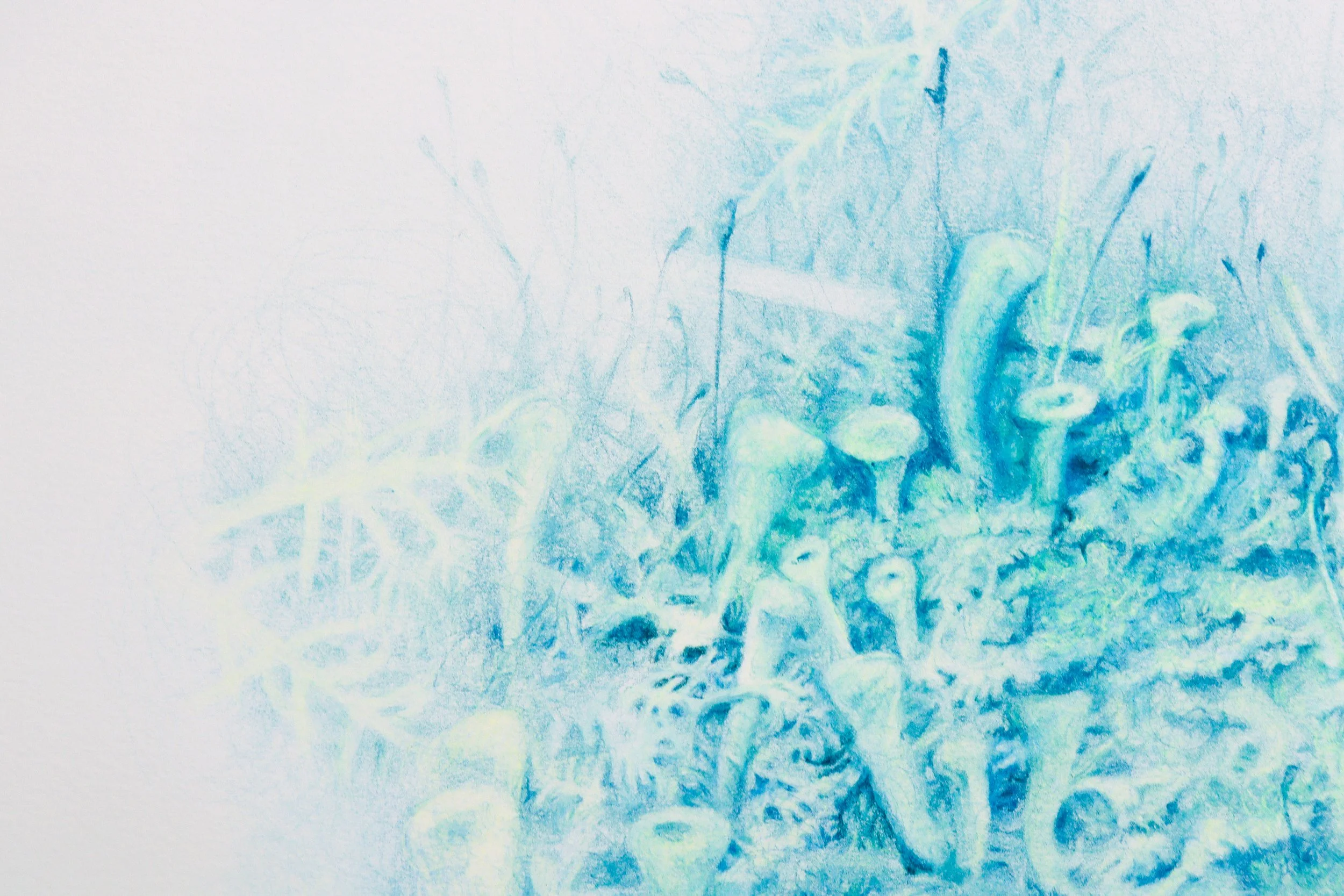 Cette série de dessins monochrome au crayon de couleur cherche à rendre tangible la sensation d’éblouissement qui nous traverse lorsque la lumière surgit au sein d’une forêt (Komorebi en japonais). Cette « forêt » est formée à partir d’une grammaire graphique et végétale proliférante, où les formes se propagent selon des règles internes, imitant une croissance autonome plutôt qu’une simple reproduction du vivant.
